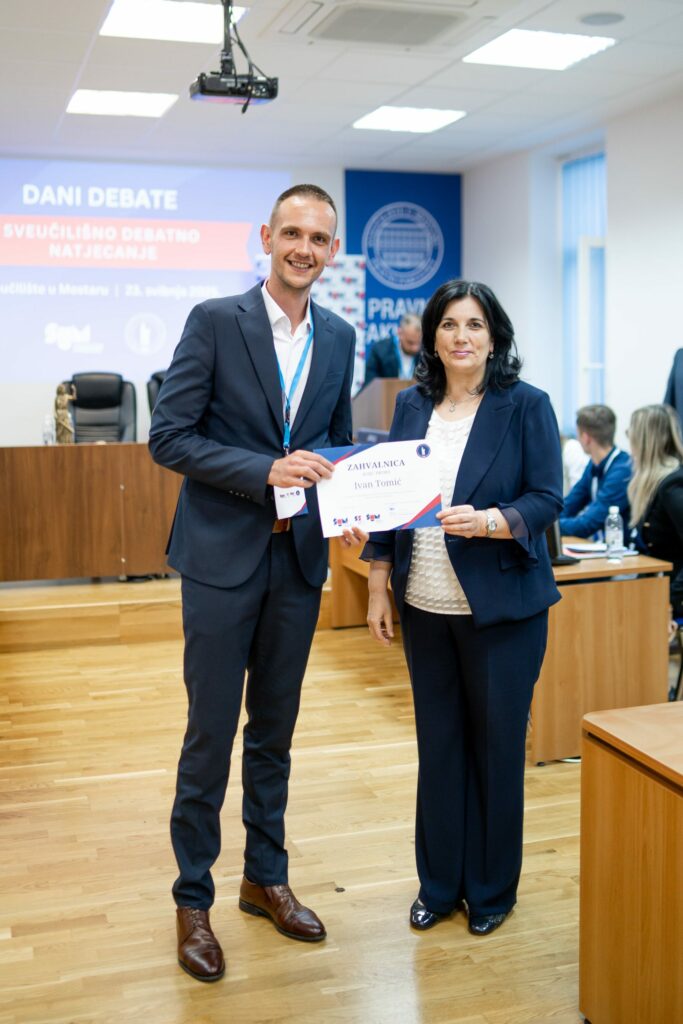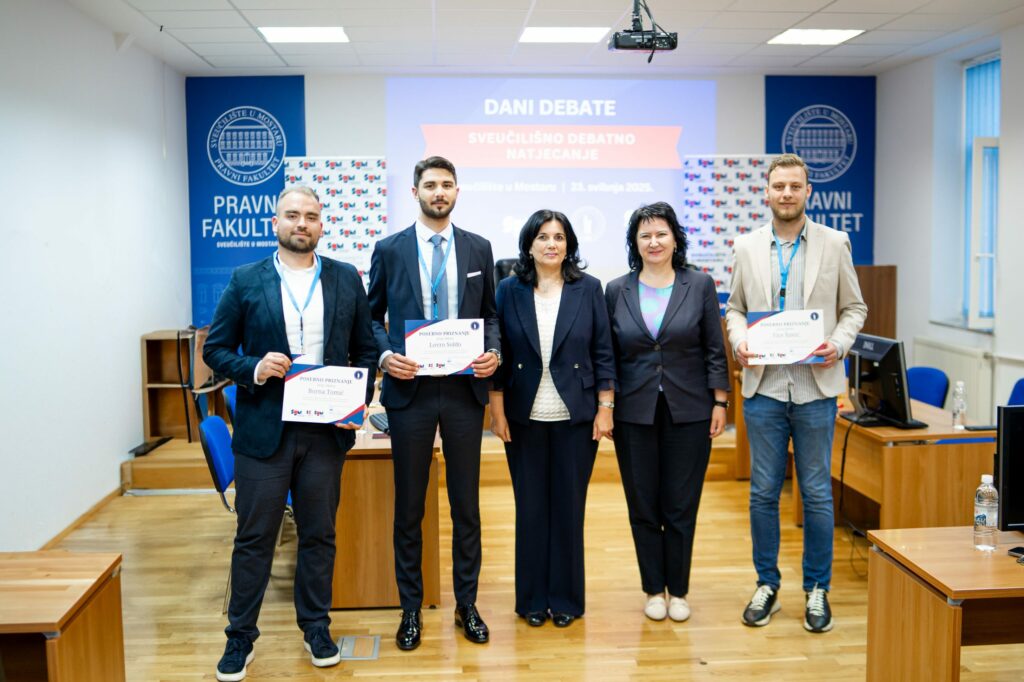 Stručni žiri činili su g. Matteo Gadžić, odvjetnik, prof. dr. sc. Denis Pajić i dr. sc. Ivan Tomić, koji su svojim znanjem i iskustvom osigurali pravedno i kvalitetno vrednovanje svih debata. Nakon napete finalne runde, Debatni klub Sveučilišta u Mostaru osvojio je prvo mjesto i zasluženo ponio titulu pobjednika. 🏆